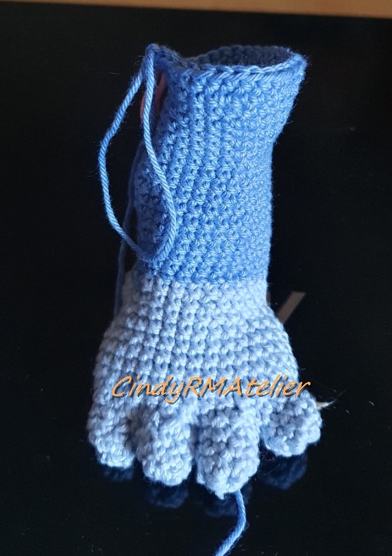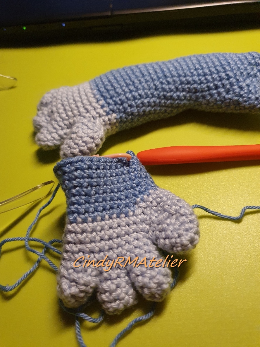 Mas vamos lá, primeiro as patinhas com os seus 4 dedinhos em tom mais claro, depois as pernas e as coxas. Os braços com a mesma dinâmica prontos para mais tarde juntar ao corpo. Das coxas segue o corpo, mas tem que haver uma maneira a formar um corpo mais redondindo; estou a pensar em fazer uma base redonda, de modo a juntar as coxas apenas pela parte anterior…